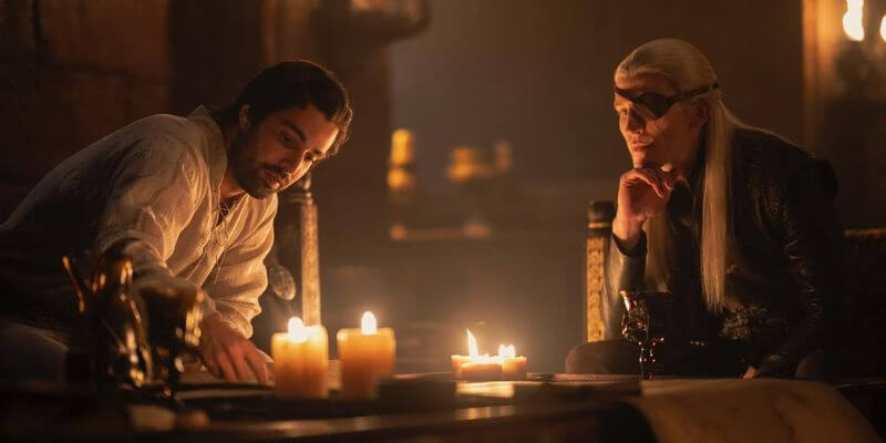 A imagem promocional oficial divulgada pelo stream traz Criston Cole e Aemond lado a lado, conspirando estrategicamente ao lado de um mapa detalhado de Westeros.